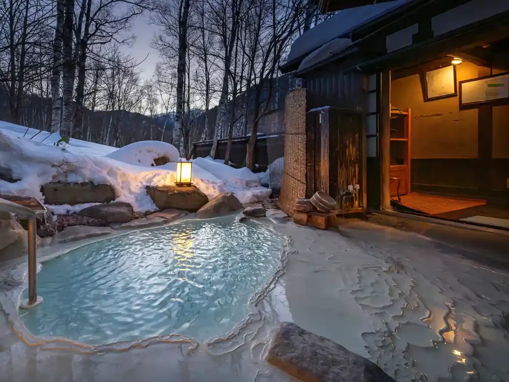 2~3人で丁度良い小さな露天風呂は雪の壁で囲まれ、その先には白樺の木が望める。湯はやわらかい硫黄の良い香りがする湯。青みがかったお湯はすっぱみもなく苦味が多少あるぐらいだった。