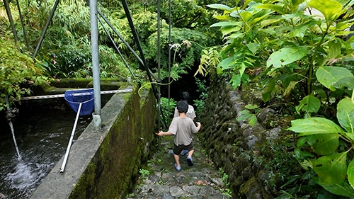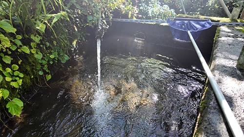 散歩道入り口には生簀があり、夕食にでるニジマスが泳いでいた。