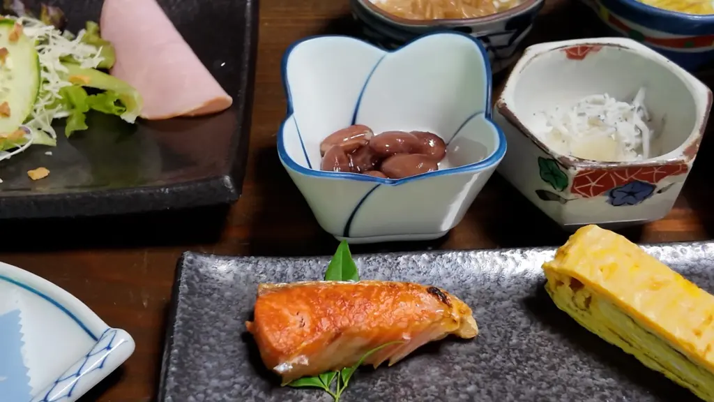 シャケ、卵焼き、ハムやキャベツといったシンプルな朝ごはん。