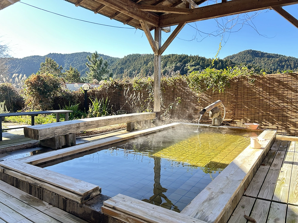 内湯から階段を登って行くと、美しい山々が見渡せる開放的な露天風呂がある。
