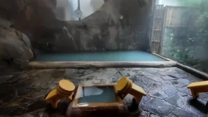 1日に何度も色が変わるそうで、私が訪問した時は運が良かったのか?青みがかった美しい白濁湯。
