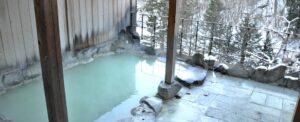 源泉は7km先から引き湯している青みがかった温泉。それほど濃厚な硫黄という感じでもなく、誰でも入りやすい温泉だと思う。温度はやや熱めだったが、冬の露天風呂などは出たり入ったりと温泉をたっぷり堪能できた。