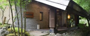 湯小屋は近代的なホテルとは対照的で重みのある色をした木造が歴史を感じさせる。