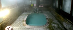 久しぶりに訪れ、苦味のほどを試そうと思いっきり口へ含んだが飲み込んだ後せきが止まらなかった。コンクリートで四角く造られた湯船の下には泥とも思える湯の花が沈殿し、足でさわるとフニャフニャしていて気持ちがいい。