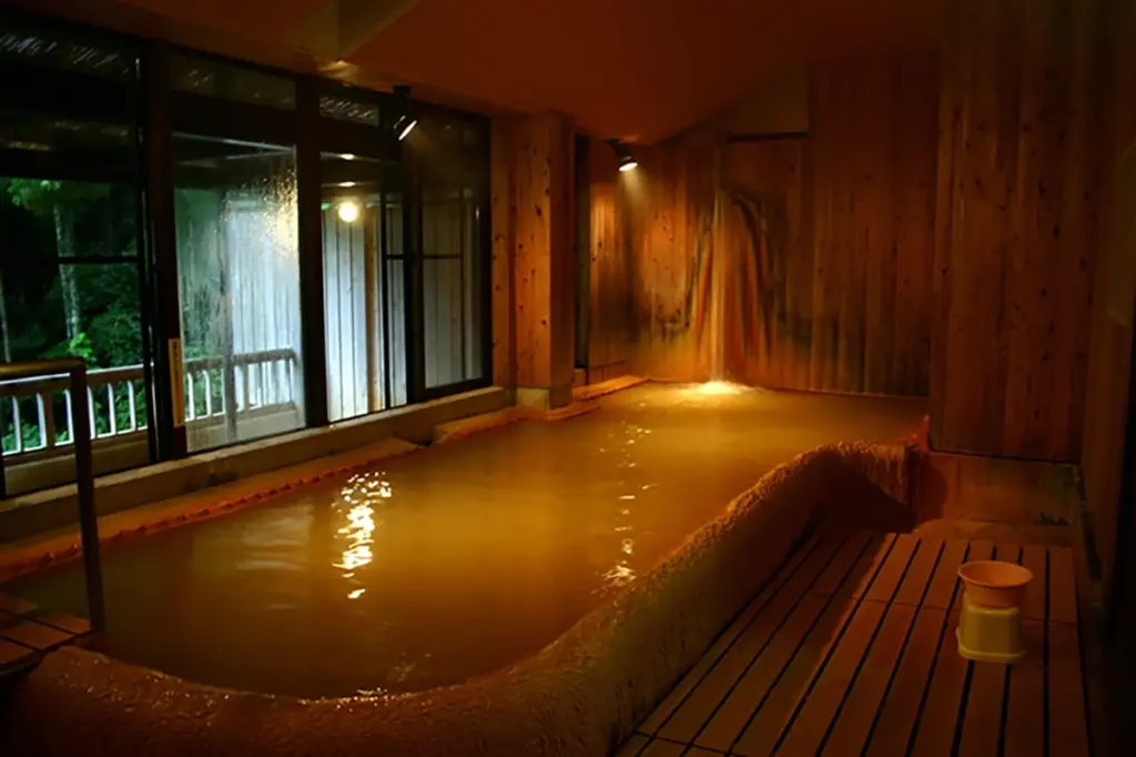 肌になじむ弱酸性の硫黄泉 赤松造りの湯船へ麗しい白濁湯が満たされる