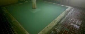 レトロな四角い湯船に緑の濁り湯 湯上りさっぱり爽快な湯