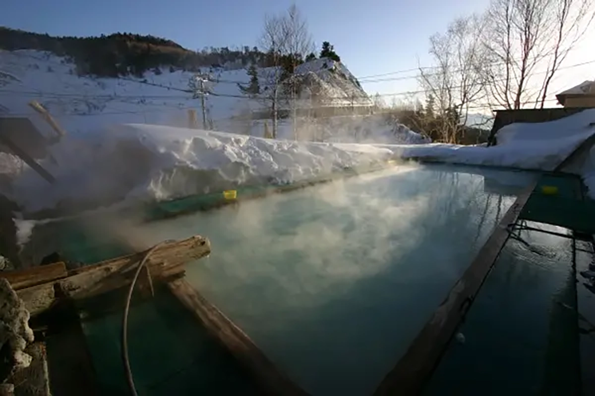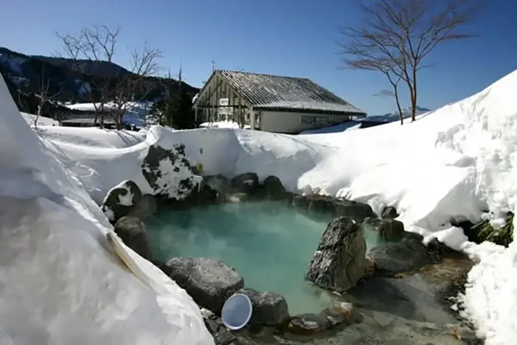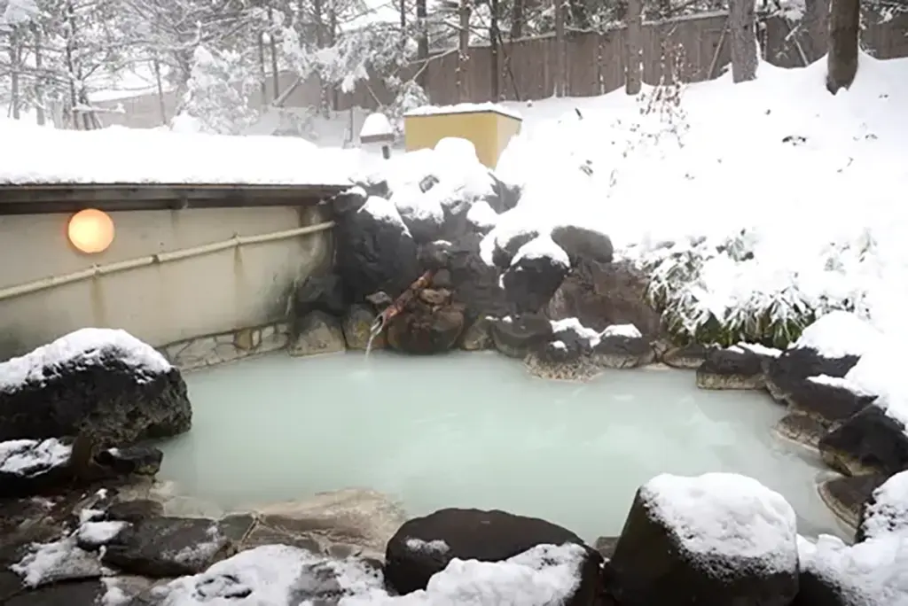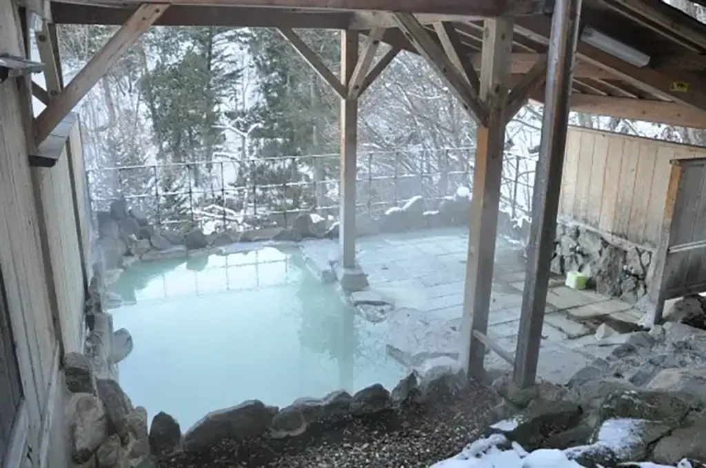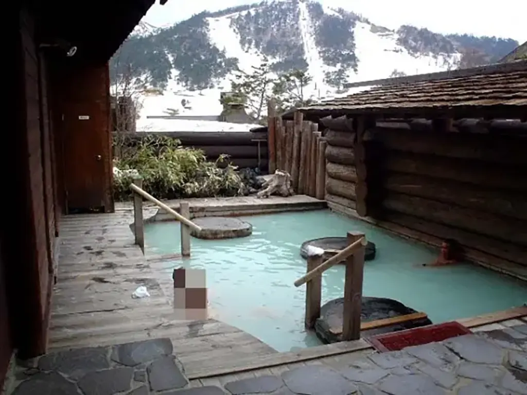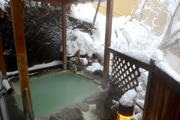 露天風呂もロッジ風の造りとなっており、その奥へは雪に覆われた山が見える。男性用は写真のように広いが女性用はこの3分の2ほどの大きさ。