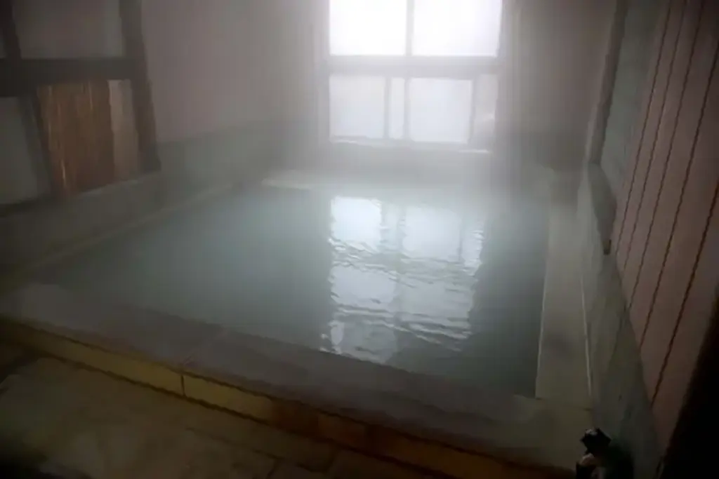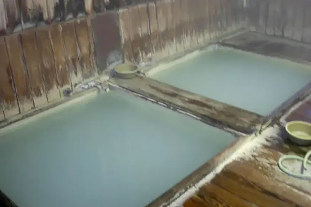 湯にはカルシウムが多く含まれているらしく、少しほっておくとすぐにカルシウムが湯面にマクをはりロウのようにコンコンたたけるほどになるという。