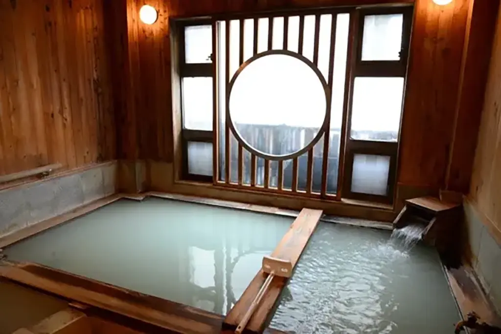 木造にやわらかいライト、レトロな窓からの明かりが美しい温泉。
