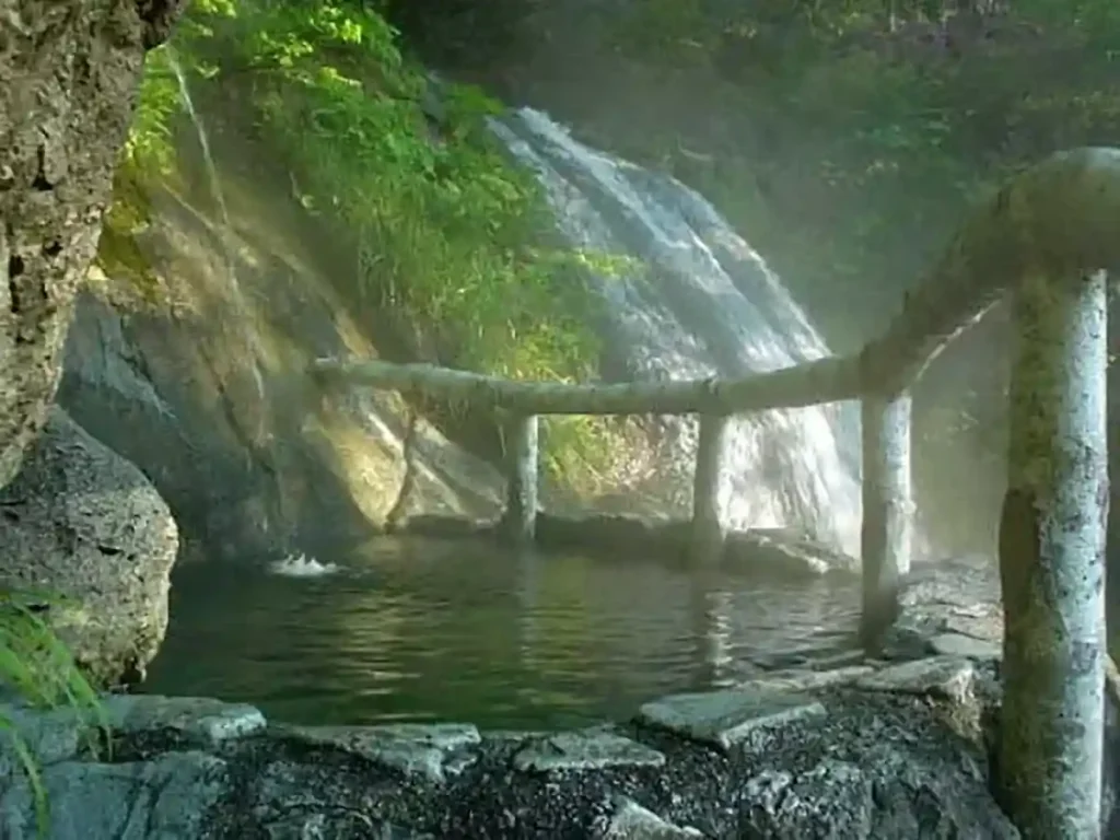 滝の横に湯船があり、浸かりながら景色を一望する事ができる。