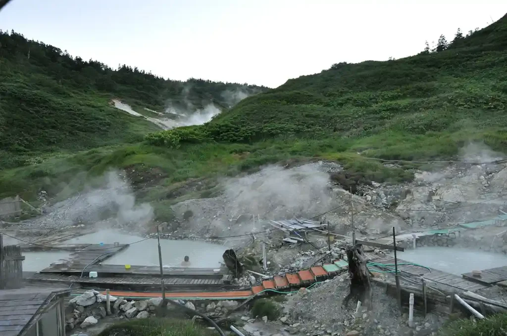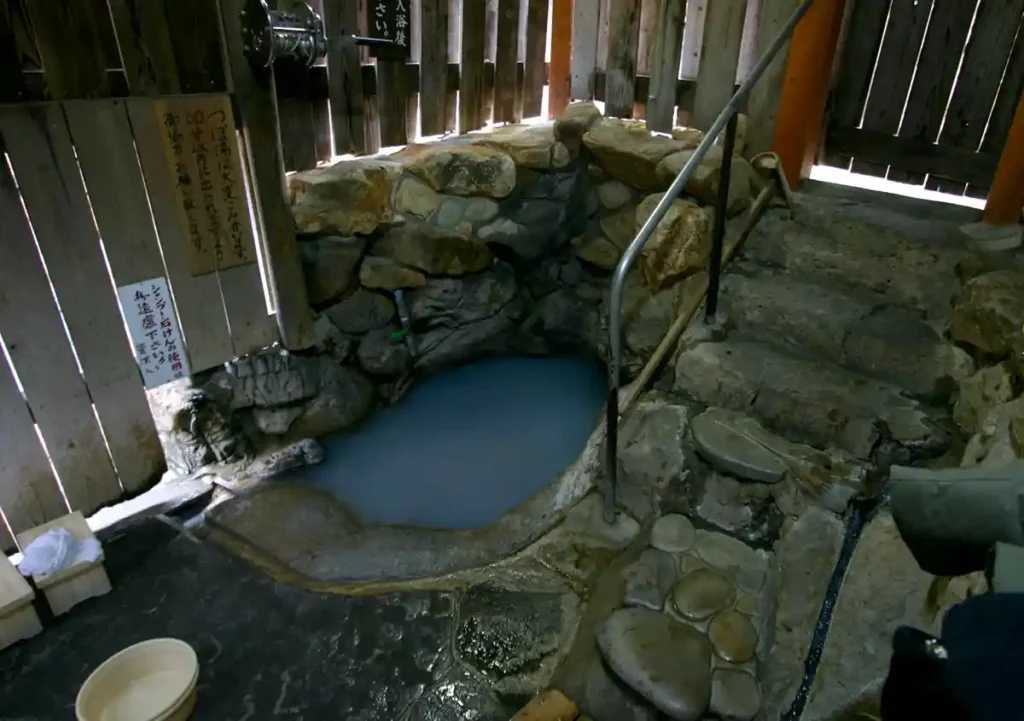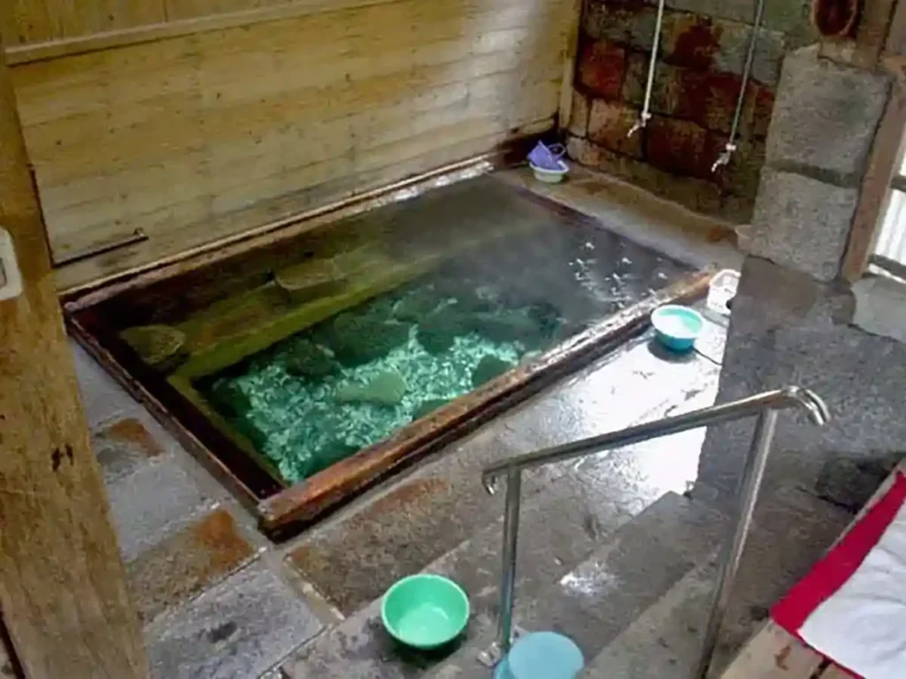 硫黄のいい香りがし、鮮やかな青紫色の湯は神秘そのものだった。足元から湯が湧いており、その量も湯船からこぼれる湯をみると多そうだ。湯はとても熱く入るのには気合が必要だが、必要に応じて加水する事ができるように蛇口が付いている。最高に気持ちの良い湯で私のお気に入りとなった。