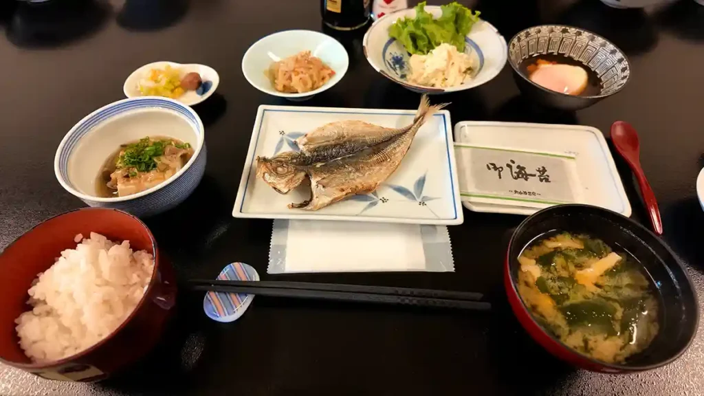 朝ごはんは理想的な朝ごはん。干物に豆腐。味噌汁もホッとする味で、満足。