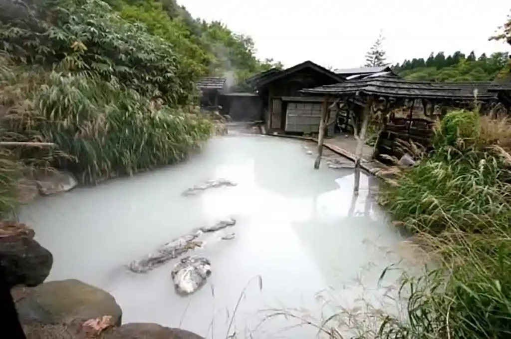湯へ浸かりながら見える景色は綺麗な緑の草や木、そして地獄の白い砂。湯船は綺麗に白濁し40人ほど入れそうな広さ。