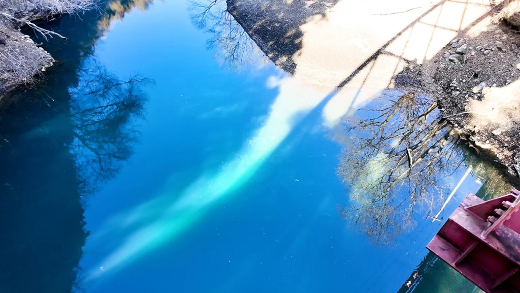 水が青く、岩盤が白っぽくて美しい。