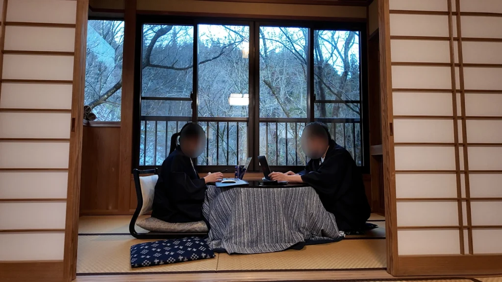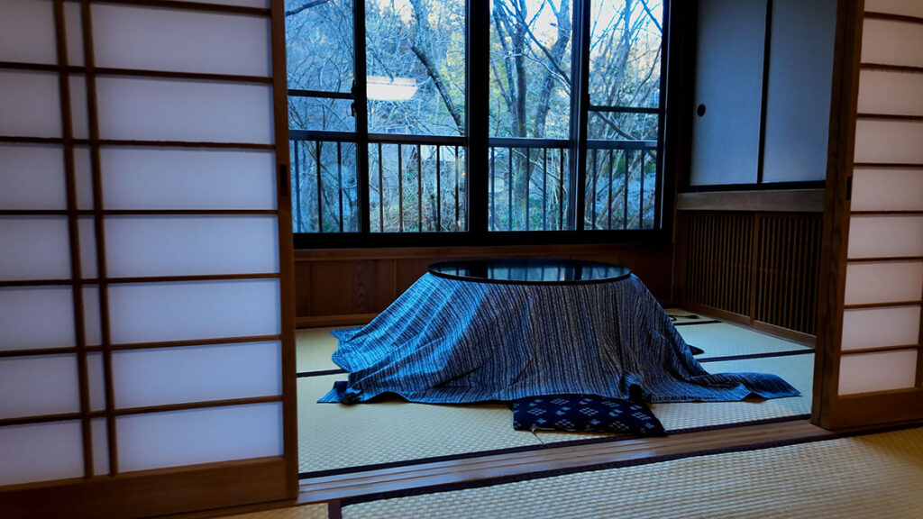 気に入ったのはこのコタツがある広縁。誰もが気に入るだろうこのスペースは広くて快適。