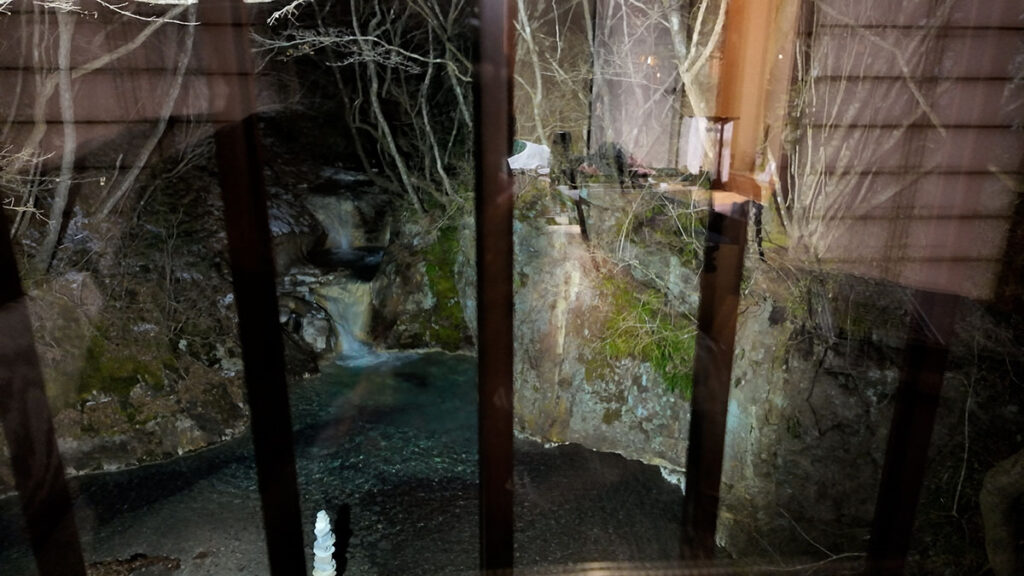 景色が部屋からと同じだったので入らなかったが、滝を見ながら入る事ができる内湯だ。