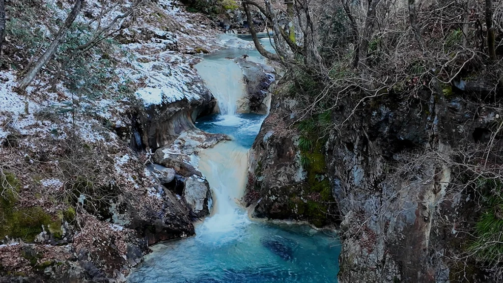 近くにある黄金の滝は岩盤が黄金のため黄金の滝と名前が付いたそうで、この丹下川の岩盤も黄金といえばそんな気もしてくるような少し黄色っぽいような、白っぽいような岩盤である。