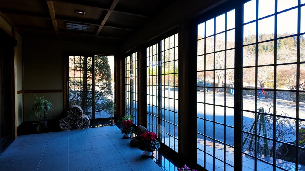 入り口から入ると格子状の窓ガラスが特徴的。とても立派で丁寧に作られている。