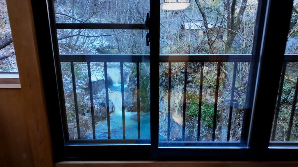 窓からは滝が見える。