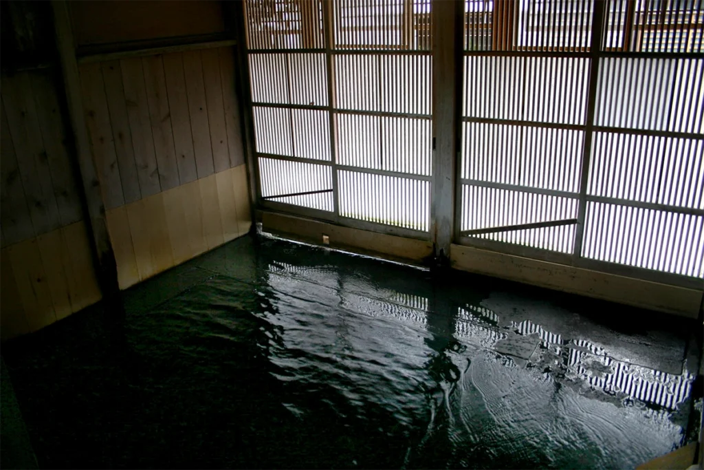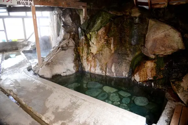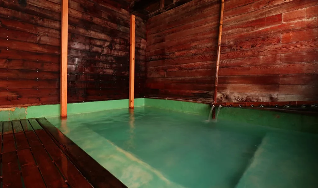 アルカリが強くヌルヌルした湯は今まで何処で体験したヌルヌル感よりも強く、しかも緑色のにごり湯と大変めずらしい泉質だ。隣にある滝の湯の蒸気と化学反応を起こしこういっためずらしい色へ変わるという。