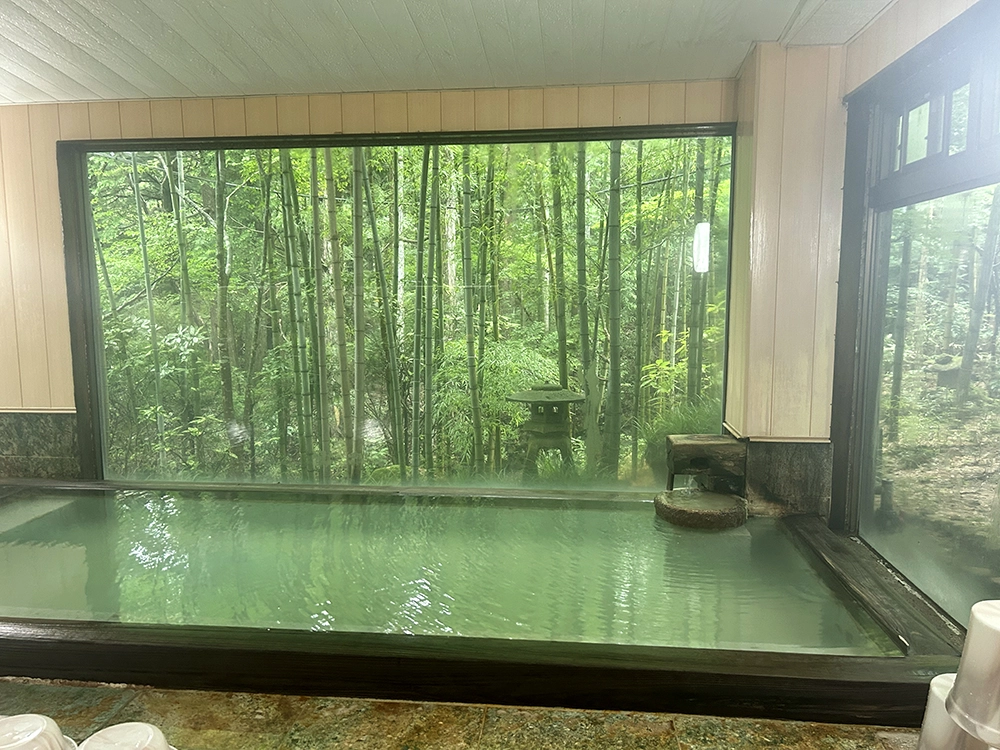 大きな窓からは緑のしげる庭が見え気持ちがいい内湯。窓を大きくあけて露天風呂気分を感じながらの入浴は最高に気持ちが良かった。