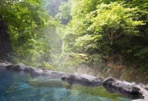 東北のダイナミックな絶景とは違い、もう少し近い絶景、川や美しい緑に囲まれた露天風呂です。