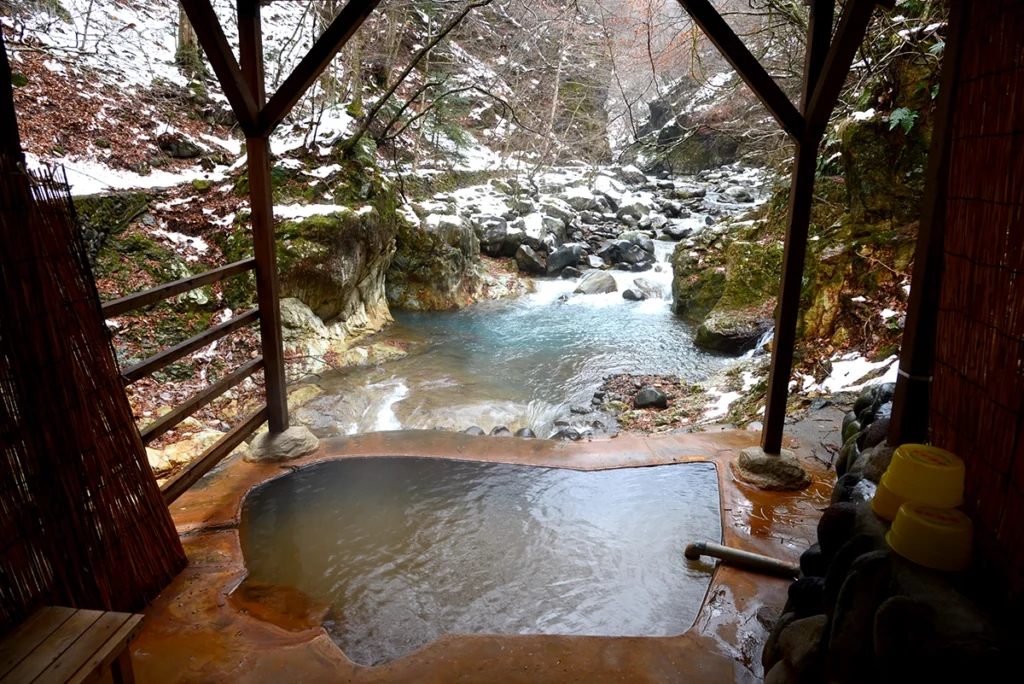 入るとザバーっと湯船から溢れ出し、川へと流れゆく。